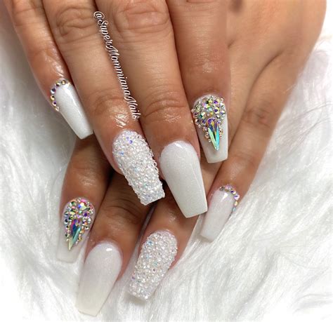white coffin acrylic nails with jewels
